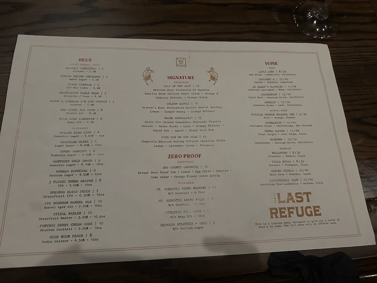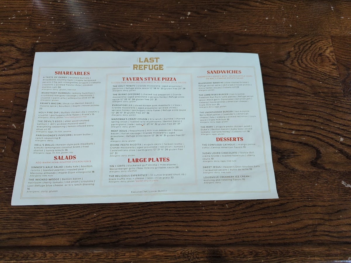 **ABOUT The Last Refuge**: Nestled in a historic 1800s German Methodist church in Louisville, Kentucky, The Last Refuge offers a unique dining experience blending rich history with modern flair. With its breathtaking atmosphere, including towering bourbon bottle walls that evoke wonder, patrons are instantly captivated. While the menu may be limited, the food is exceptional, crafted to exceed expectations. Signature cocktails and an impressive whiskey selection, highlighted by their extensive whiskey room, elevate every visit. Exceptional service, led by passionate staff, adds to the unforgettable experience, making it a must-visit for whiskey enthusiasts and culinary explorers alike.